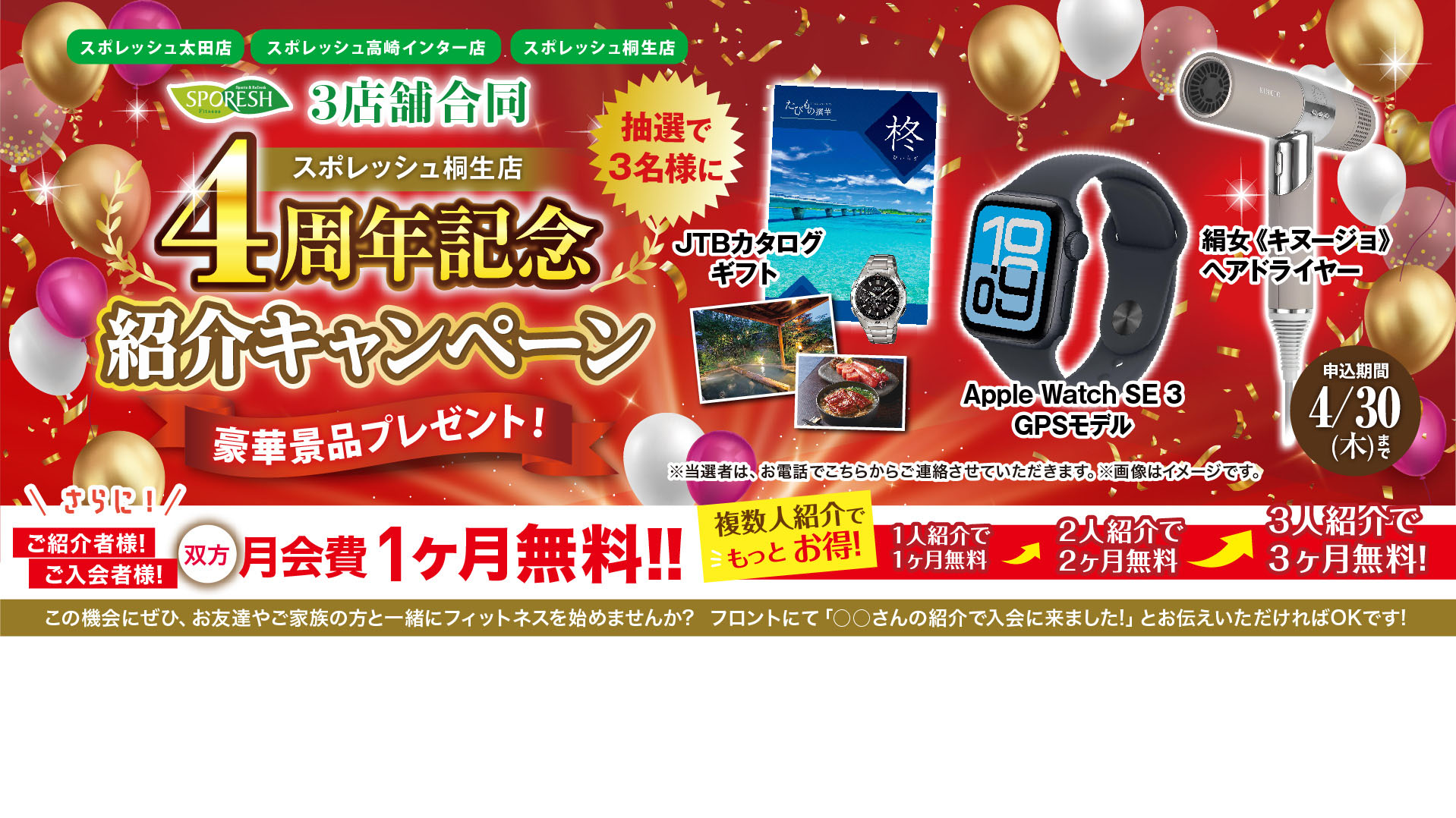 4月紹介キャンペーン 4月の特典は当店の4周年を記念して3店舗合同の豪華景品を3名様にプレゼント! 更に...